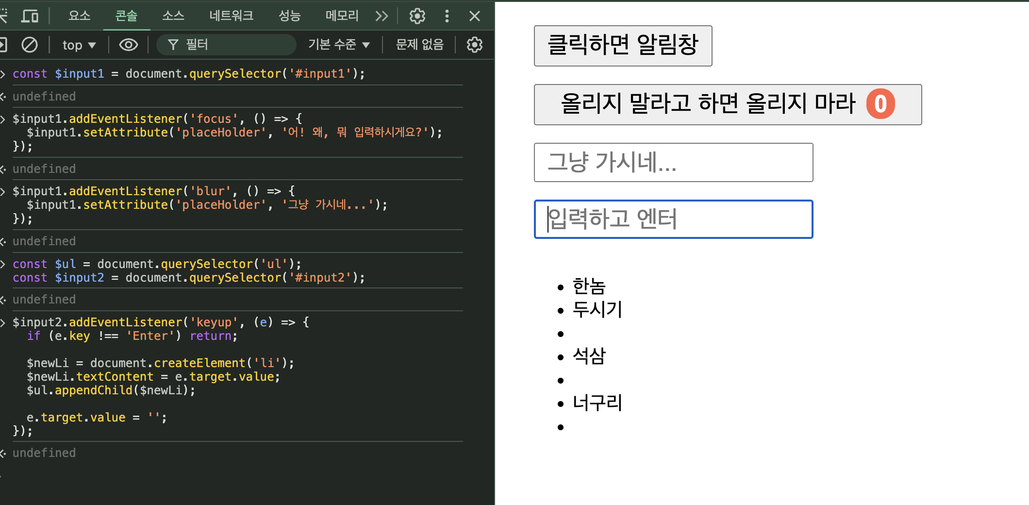 첫 번째 인자로 주어진 이벤트에, 두 번째 인자로 주어진 함수의 동작을 부여 콜백함수라고 부름