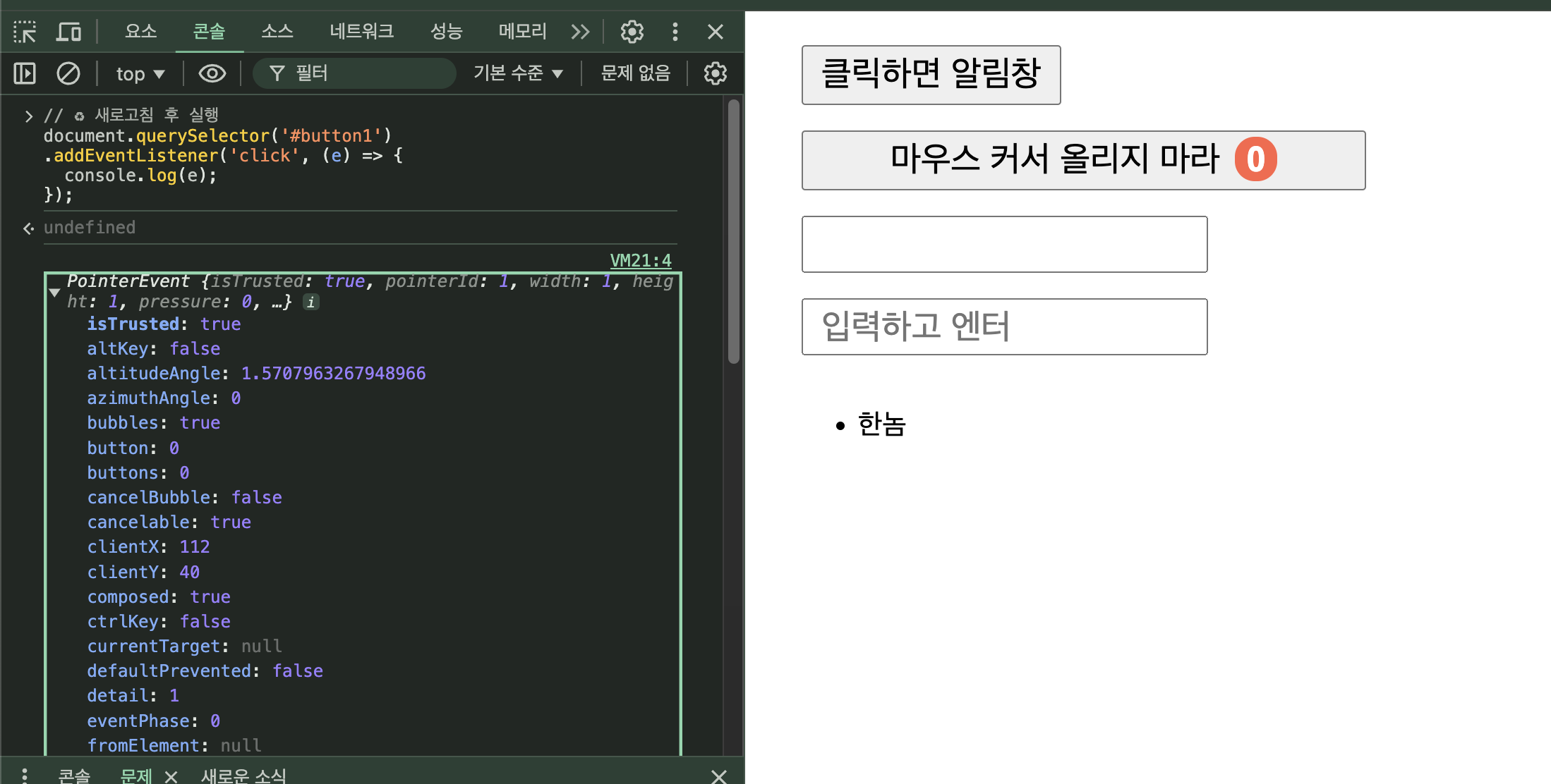 | onemouseover | HTML 요소 외부로부터 요소 위로 마우스를 이동할 때 발생 |