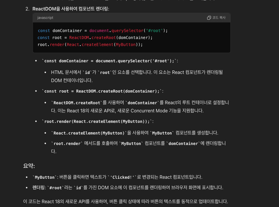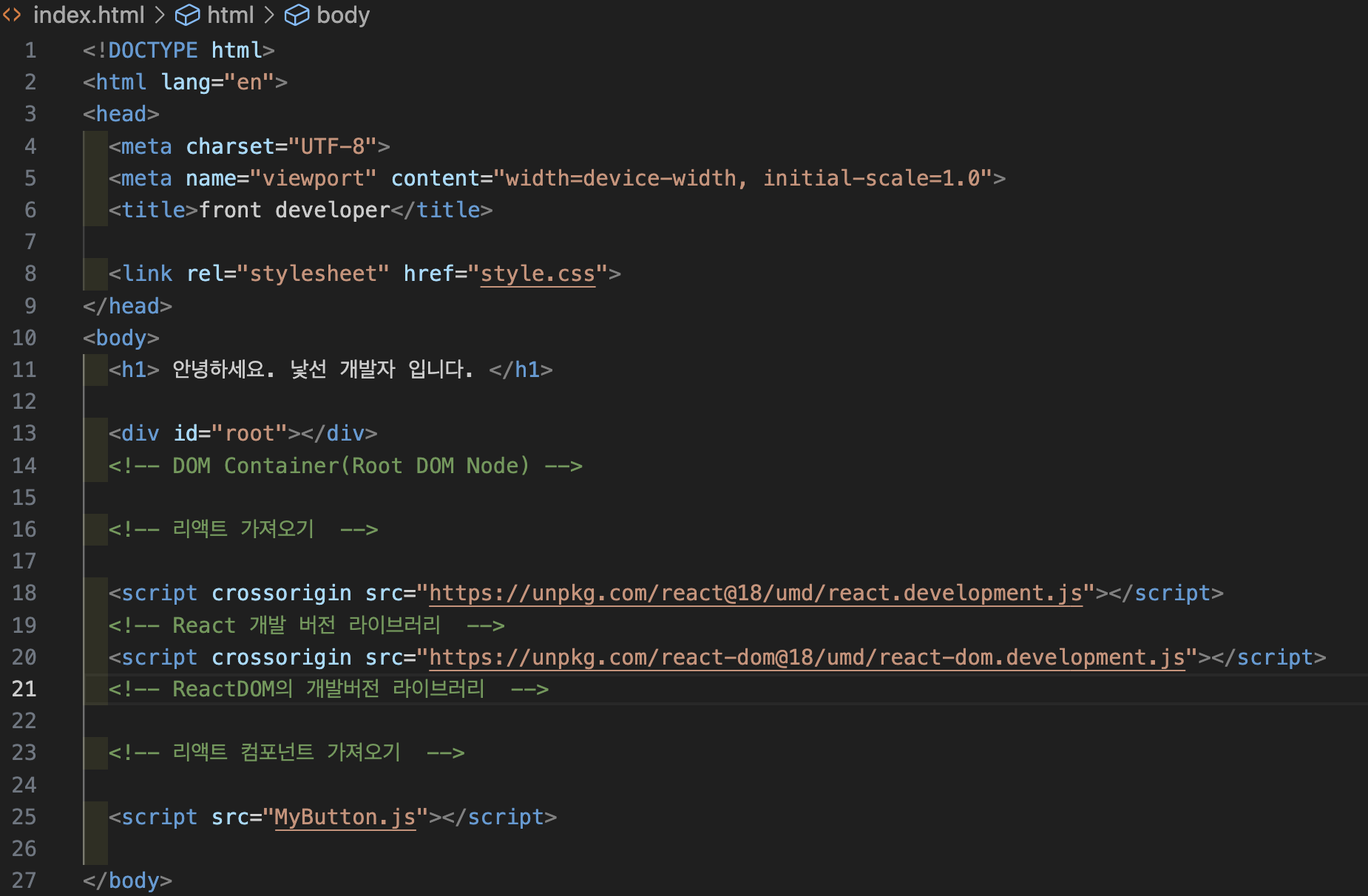 리액트를 연동하기 위해서는 react, react-dom 이렇게 두 개의 자바스크립트 파일을 가져온다. js 연결링크는 리액트 컴포넌트를 가져오는 코드이다.