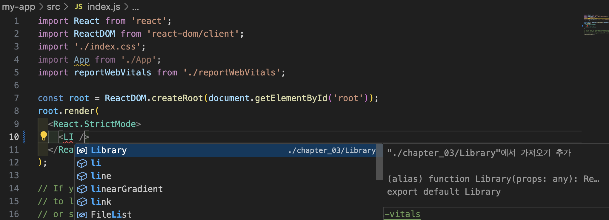 아마 확장프로램이 설치가 되어 있어서 컴포너늩를 가져오면 자동으로 import가 생성될 것이다. ReactDOM을 사용해 root DOM node에 랜더링하도록 코드를 수정한 것.