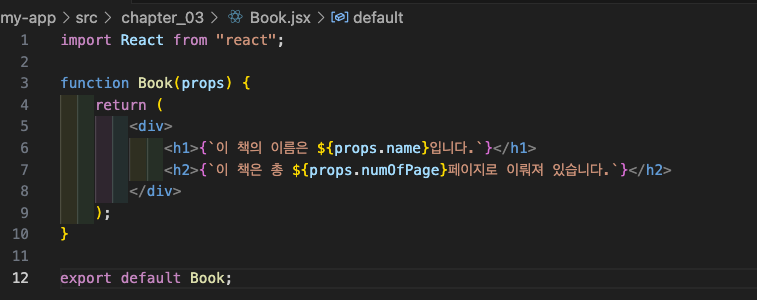 위 jsx 파일에 Book이라는 이름의 리액트 함수 컴포넌트를 하나 만든다.