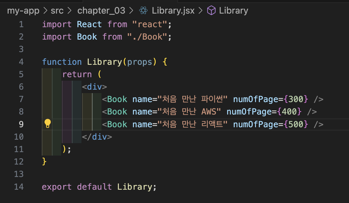 Library 컴포넌트는 총 세 개의 Book 컴포넌트를 랜더링하고 있다. 실제 만든 컴포넌트를 화면에 랜더링하기 위해서 index.js 파일을 수정해야한다.