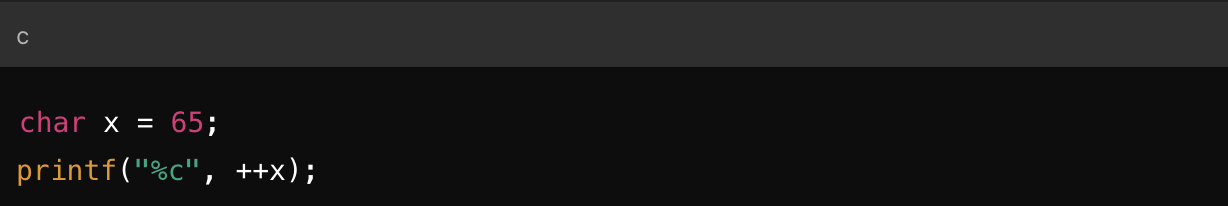 문자형 변수 'x'를 선언하고 '65'라는 값을 할당 했다. 65는 아스키 코드 값으로 문마 'A'에 해당된다.