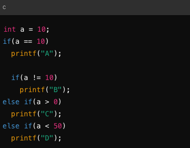 else if(a > 0) : a가 0보다 큰지 확인. 이 조건은 참이므로 "C"가 출력됩니다.