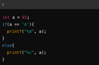 if(a == 'A') : a가 문자 'A'와 같은지 확인. 여기서 'A'는 아스키 코드 값으로 65. 따라서 이 조건은 참.