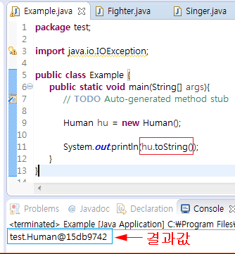 이때 반환되는 문자열은 클래스 이름과 함께 구분자로 @가 사용되며, 그 뒤로 16진수 해시 코드(hash code)가 추가된다. 해시 코드 값은 인스턴스의 주소를 해싱하여 변환한 값으로, 고유 숫자로서 인스턴스마다 모두 다르게 반환된다.