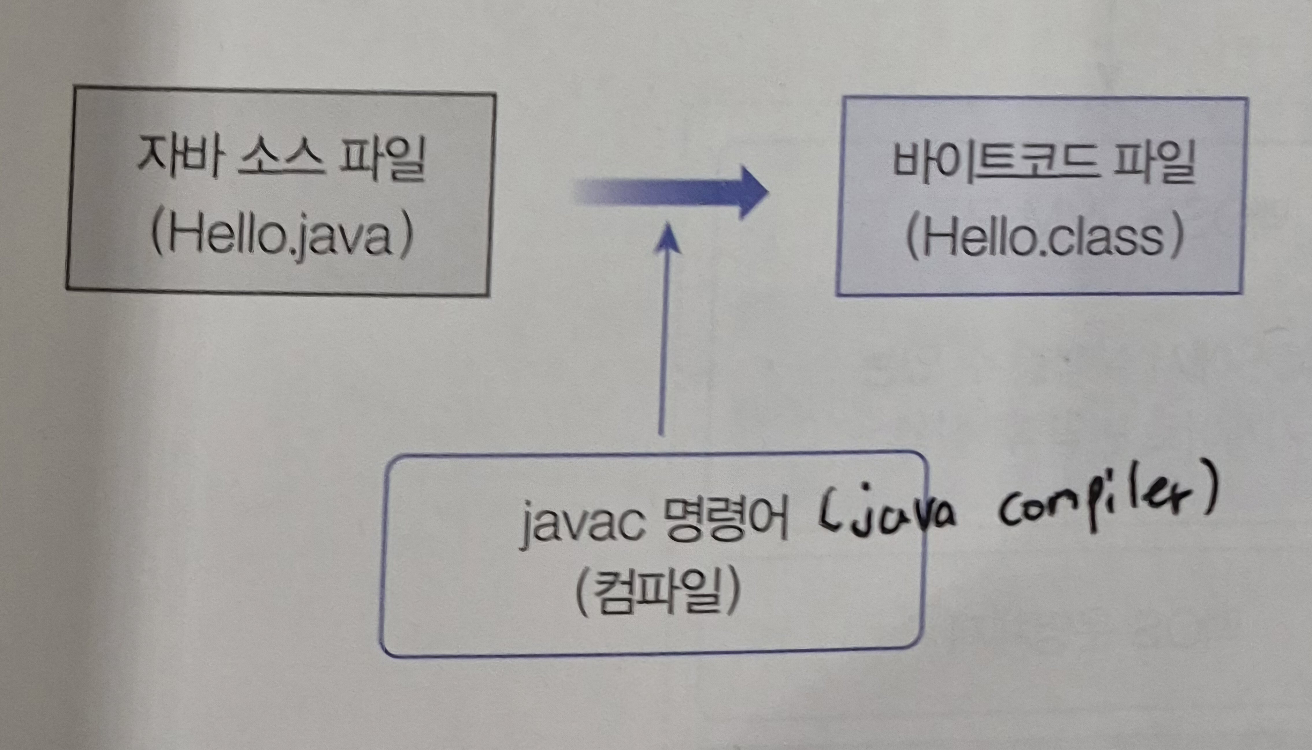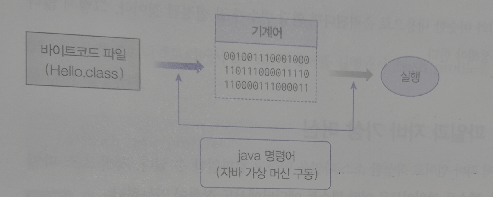 소스파일(.java)은 javac(java compiler) 실행파일에 의해 컴파일되어 바이트코드(.class)파일이 된다. 바이트코드 파일을 특정 운영체제가 이해하는 기계어로 번역하고 실행시키는 명령어는 java이다. java 명령어는 JDK와 함께 설치된 자바 가상 머신을 구동시켜 바이트코드 파일을 완전한 기계어로 번역하고 실행시킨다.