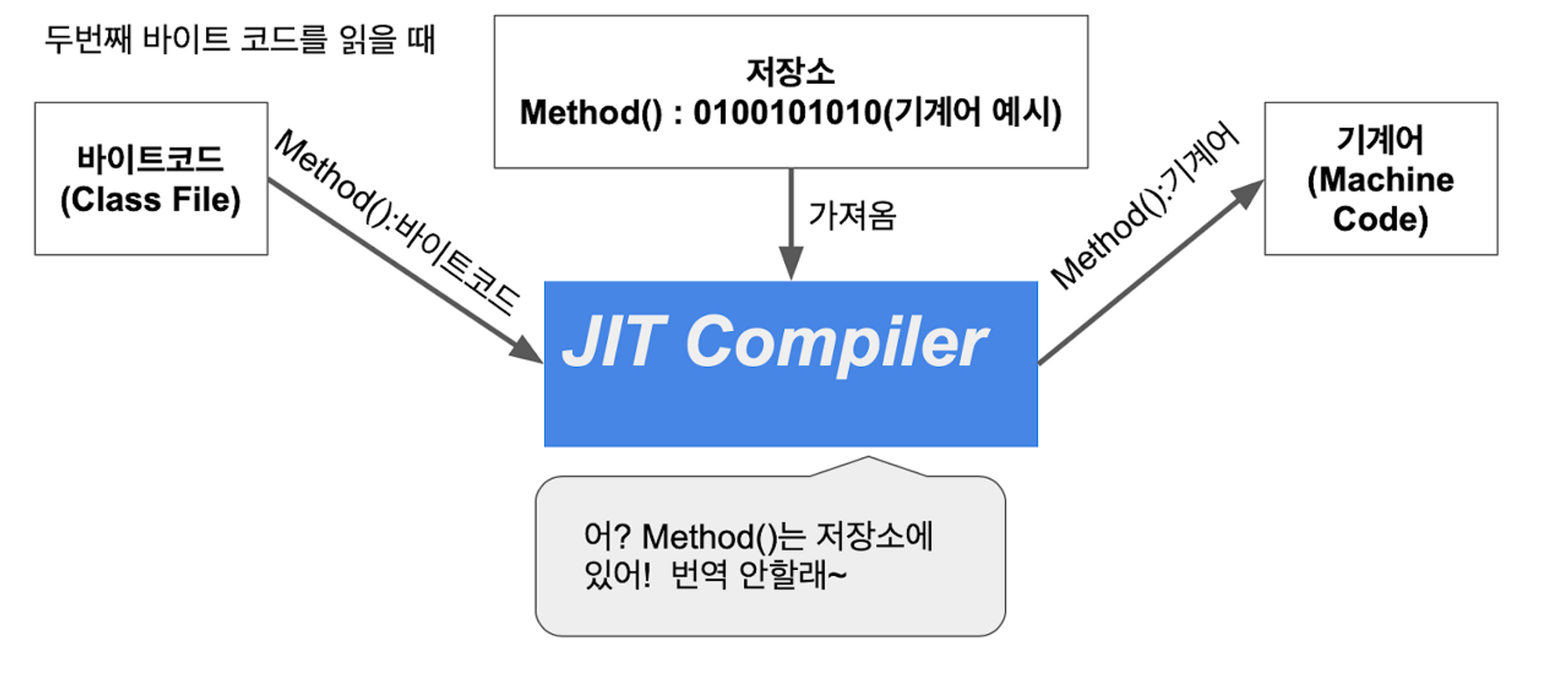 “정확히는 JIT 컴파일러가 ‘번역 안 할래’가 아니라, 이미 자주 실행되는 부분을 미리 기계어로 컴파일해두므로 인터프리터가 해당 부분을 굳이 한 줄씩 해석하지 않아도 된다는 뜻이다.”