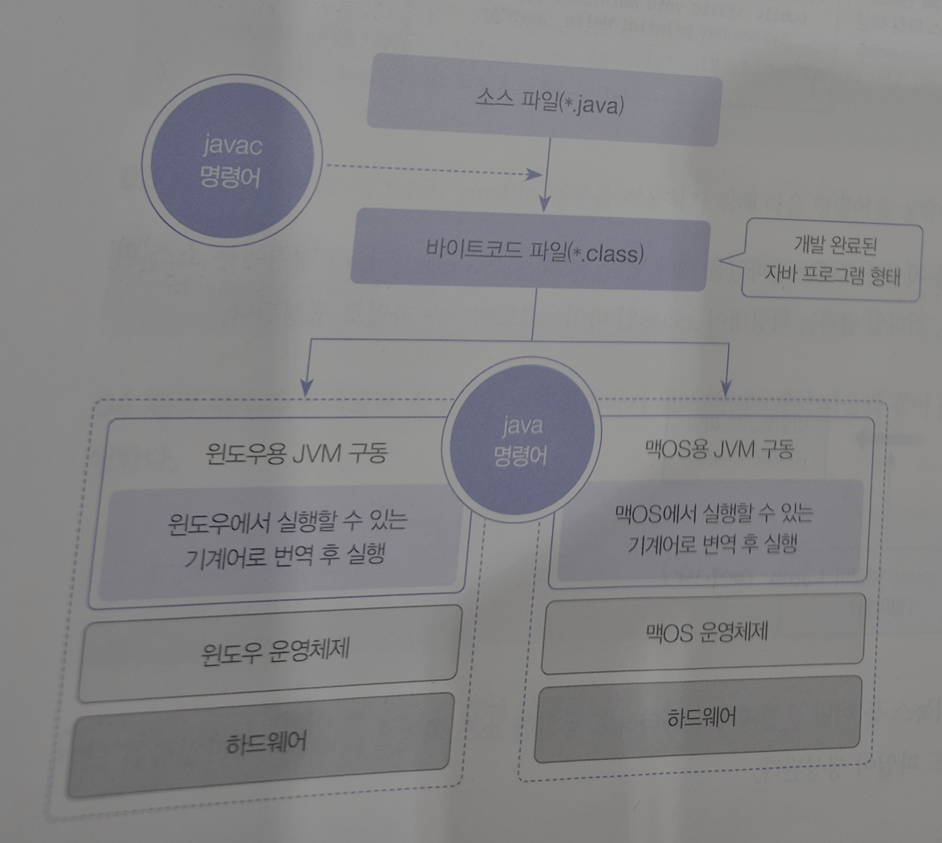 바이트코드(Bytecode) 파일은 운영체제와 상관없이 모두 동일한 내용으로 생성되지만, 자바 가상 머신(JVM, Java Virtual Machine)은 운영체제에서 이해하는 기계어로 번역해야 하므로 운영체제별로 다르게 설치된다. 그래서 운영체제별로 설치하는 JDK가 다른 것이다.