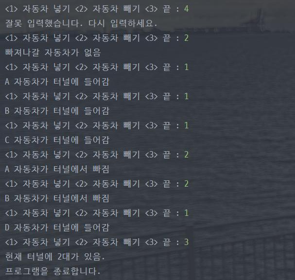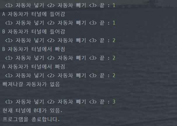 System.out.print("<1> 자동차 넣기 <2> 자동차 빼기 <3> 끝 : ");
