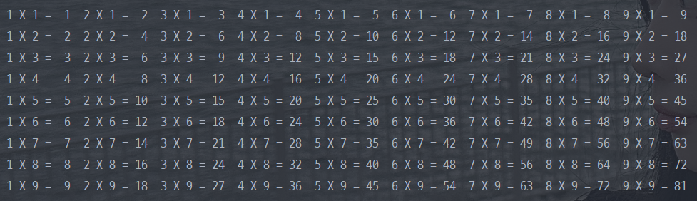 System.out.printf("%d X %d = %2d\t", k + 1, i + 1, aa[k][i]);