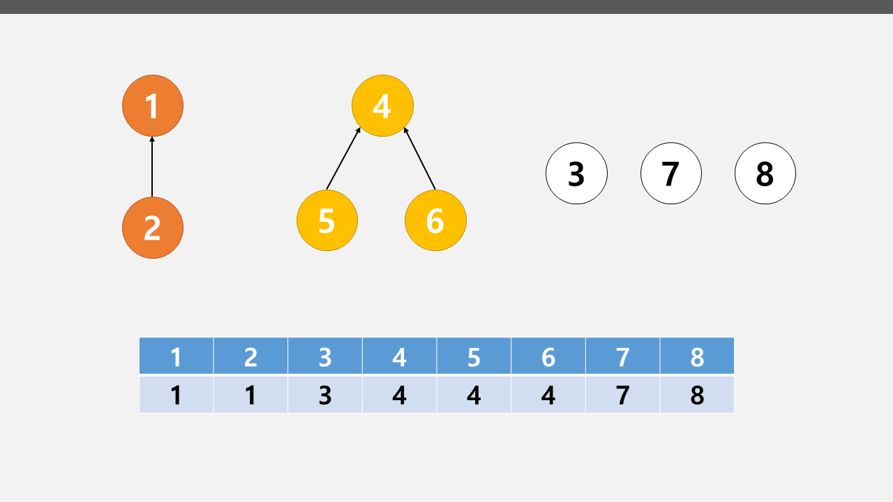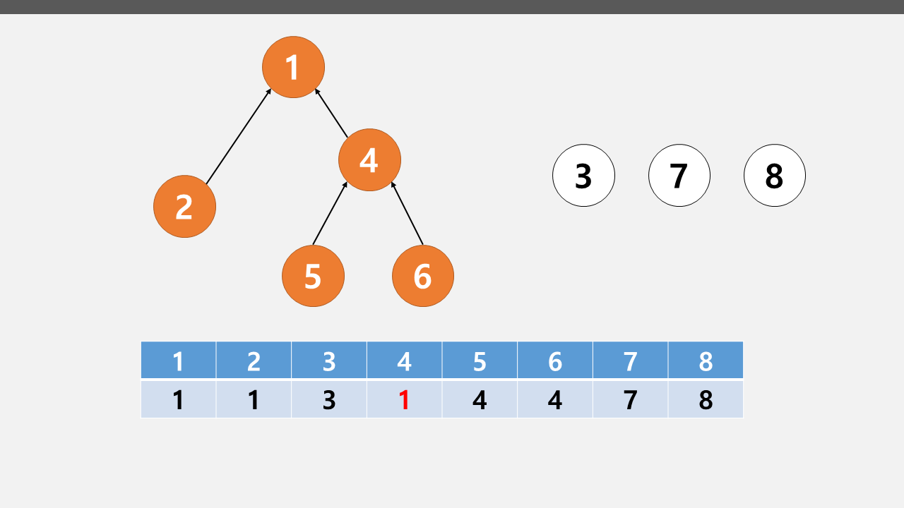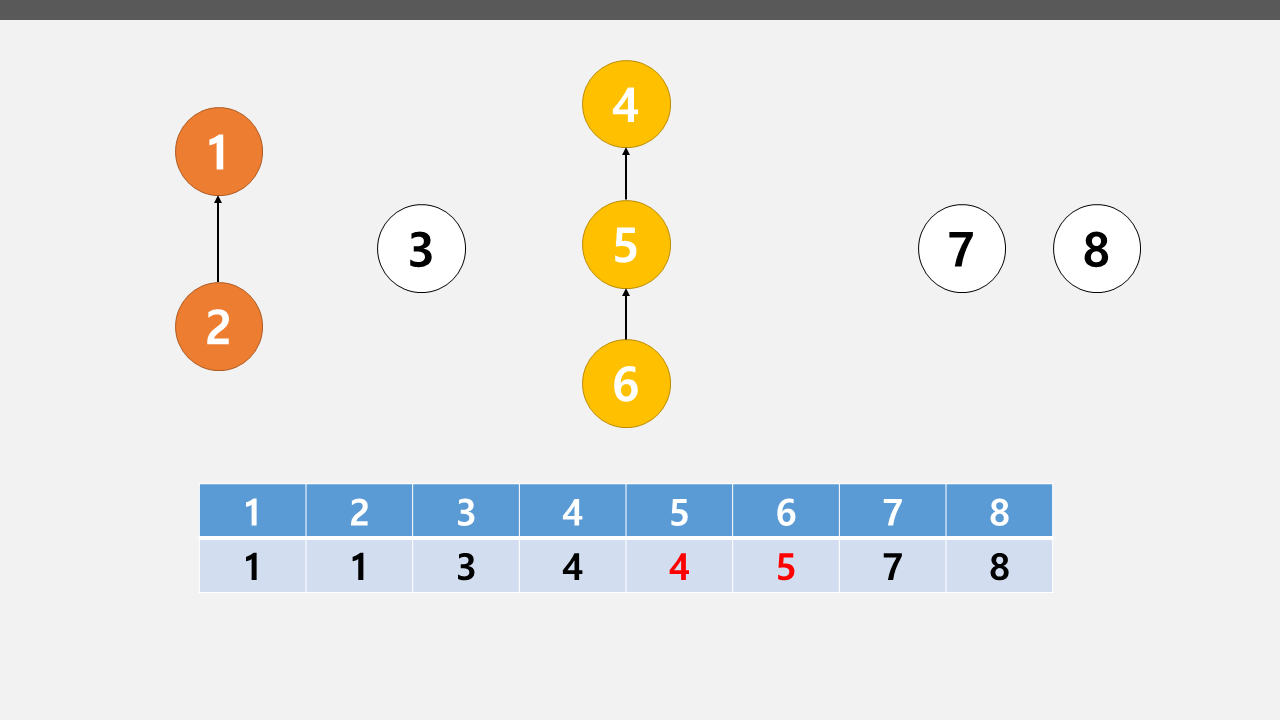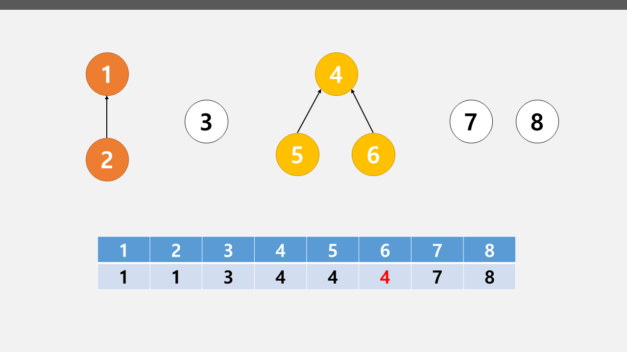 4. 배열의 인덱스와 값이 일치한다. 4번 노드가 6번 노드가 속해있는 트리의 루트 노드이다.