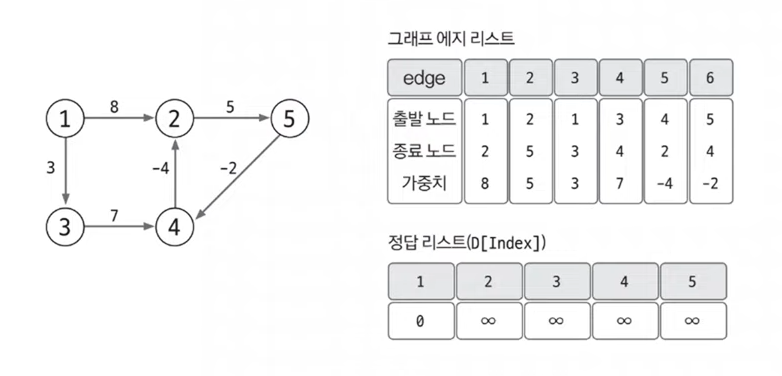 벨만-포드 알고리즘은 에지를 중심으로 동작하므로 그래프를 에지 리스트로 구현한다. 또한 최단 경로 리스트를 출발 노드는 0, 나머지 노드는 무한대로 초기화한다.