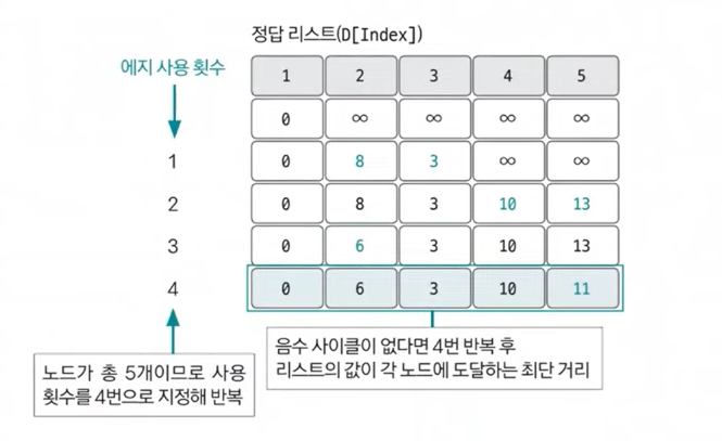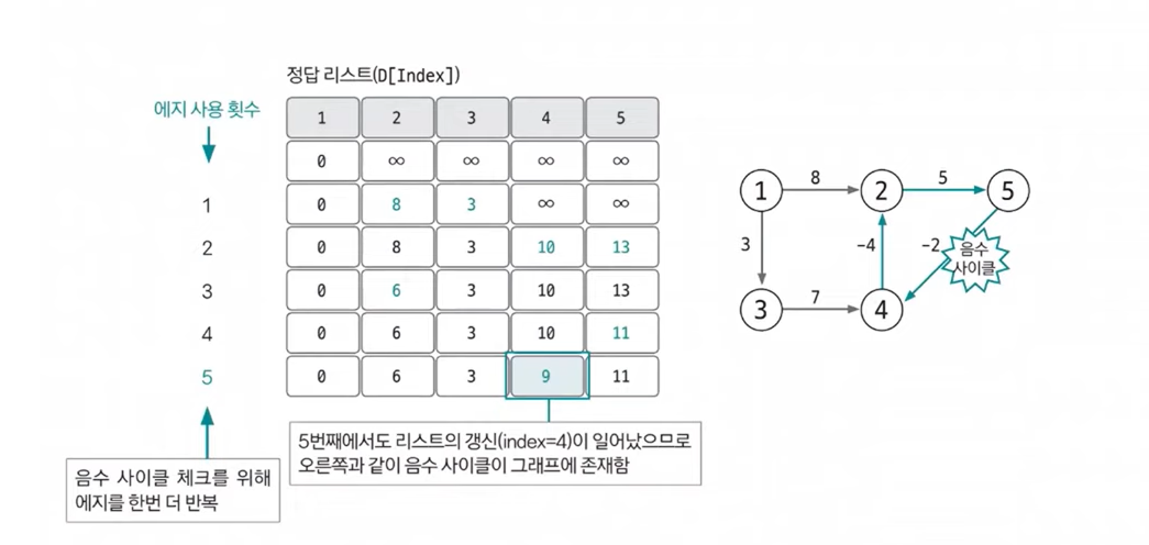 음수 사이클 유무를 확인하기 위해 모든 에지를 한 번씩 다시 사용해 업데이트되는 노드가 발생하는지 확인한다. 만약 업데이트되는 노드가 있다면 음수 사이클이 있다는 뜻이 되고, 2단계에서 도출한 정답 리스트가 무의미하고 최단 거리를 찾을 수 없는 그래프라는 뜻이 된다. 음수 사이클이 존재하면 이 사이클을 무한하게 돌수록 가중치가 계속 감소하므로 최단 거리를 구할 수 없다.