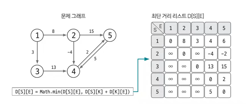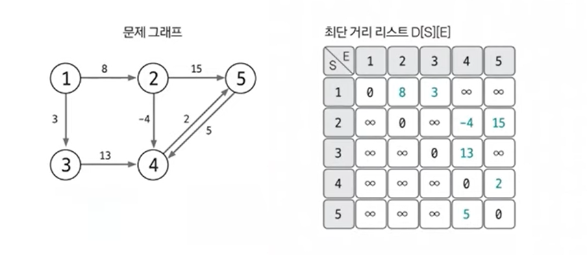 출발 노드는 S, 도착 노드는 E, 이 에지의 가중치는 W라고 했을 때 D[S][E] = W로 에지의 정보를 리스트에 입력한다. 이로써 플로이드-워셜 알고리즘은 그래프를 인접 행렬로 표현한다는 것을 알 수 있다.