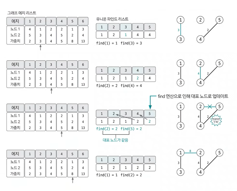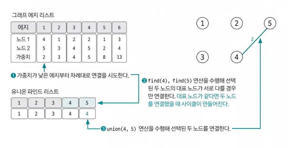가중치가 낮은 에지부터 순서대로 선택해 연결을 시도한다. 이때 바로 연결하지 않고 이 에지를 연결했을 때 그래프에 사이클 형성 유무를 find 연산을 이용해 확인한 후 사이클이 형성되지 않을 때만 union 연산을 이용해 두 노드를 연결한다.
