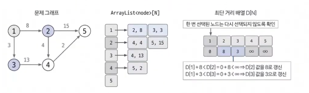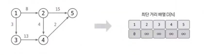 최단 거리 배열을 만들고, 출발 노드는 0, 이외의 노드는 무한으로 초기화한다. 이때 무한은 적당히 큰 값을 사용하면 된다.
