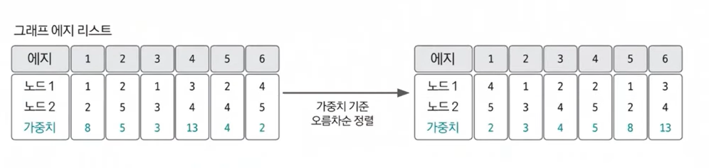 에지 리스트에 담긴 그래프 데이터를 가중치 기준으로 오름차순 정렬한다.