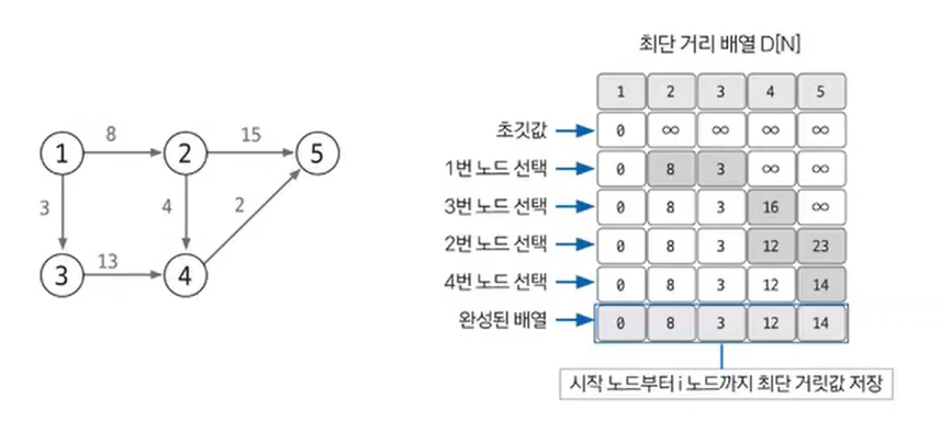 모든 노드가 처리될 때까지 과정 3~4를 반복한다. 과정 4에서 선택 노드가 될 때마다 다시 선택되지 않도록 방문 배열을 만들어 처리하고, 모든 노드가 선택될 때까지 반복하면 최단 거리 배열이 완성된다.