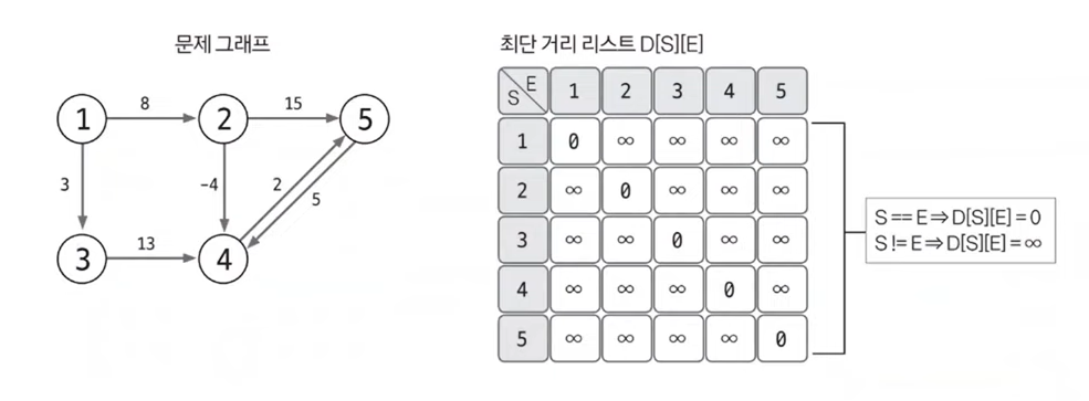 D[S][E]는 노드 S에서 노드 E까지의 최단 거리를 저장하는 리스트라 정의한다. S와 E의 값이 같은 칸은 0, 다른 칸은 무한대로 초기화한다. 여기에서 S == E는 자기 자신에게 가는 데 걸리는 최단 경로값을 의미하기 때문이다.