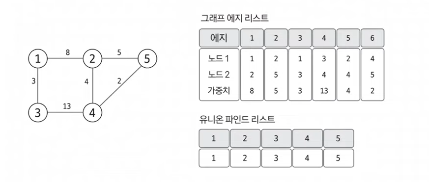 최소 신장트리는 데이터를 노드가 아닌 에지 중심으로 저장하므로 인접 리스트가 아닌 에지 리스트의 형태로 저장한다. 이 리스트는 일반적으로 노드 변수 2개와 가중치 변수로 구성된다. 사이클 처리를 위한 유니온 파인드 리스트도 함께 초기화한다. 리스트의 인덱스를 해당 자리의 값으로 초기화하면 된다.