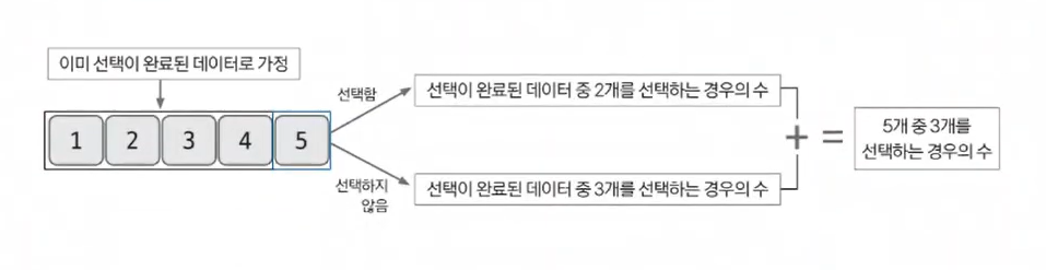 모든 부분 문제가 해결된 상황이라고 가정하자. 먼저 5개의 데이터 중 4개를 이미 선택이 완료된 데이터라고 가정한다. 그리고 마지막 데이터의 선택 여부에 따른 경우의 수를 계산한다. 만약 마지막 데이터를 포함해 총 3개의 데이터를 선택하려면 선택이 완료됐다고 가정한 4개의 데이터에서 2개를 선택해야 한다. 마지막 데이터를 포함하지 않고 총 3개의 데이터를 선택하려면 이전 데이터 4개중 3개를 선택해야 한다. 2가지 경우의 수를 합치면 데이터 5개 중 3개를 선택하는 경우의 수가 나온다.