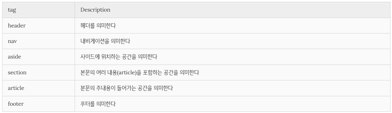 다음은 HTML5에서 새롭게 추가된 시맨틱 태그이다.