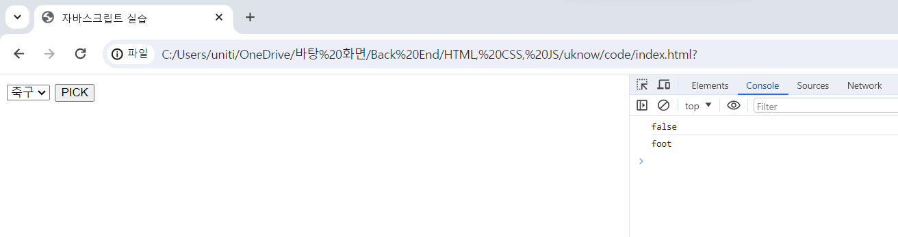 result = select.value == "foot" ? "축구를 선택했네요" : "축구를 선택하지 않았네요"