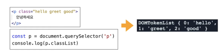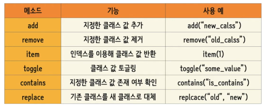 • 웹 요소(Element)로부터 클래스 콜렉션을 반환하는 읽기 전용 속성이다.