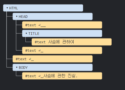 위와 같은 문서가 있을 때, DOM 은 다음과 같은 태그 트리 구조로 구성됩니다.