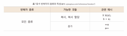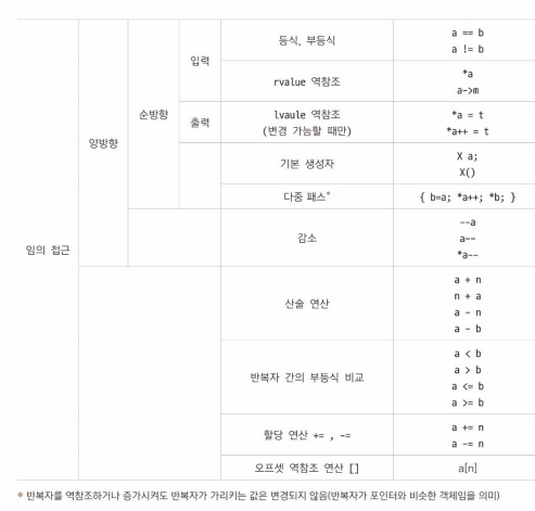 - STL에서 모든 컨테이너는 자신만의 반복자를 제공하는데, 컨테이너의 특성에 따라 각각의 반복자가 사용할 수 있는 연산과 함수가 다름