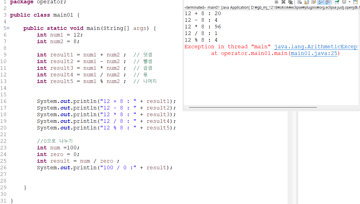 :더하기 + ,뺄셈- ,곱셈 * ,몫 / ,나머지 %
