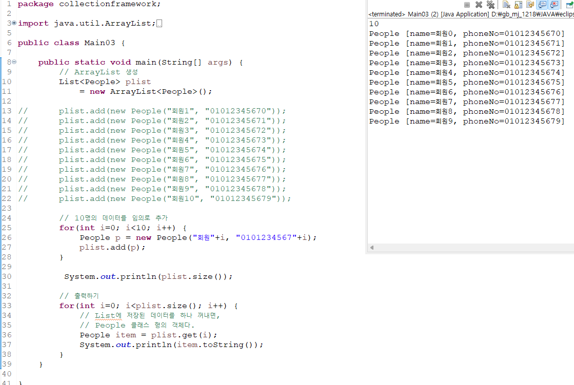 상위 인터페이스 형으로 선언하고 ArrayList클래스로 객체를 할당하며,