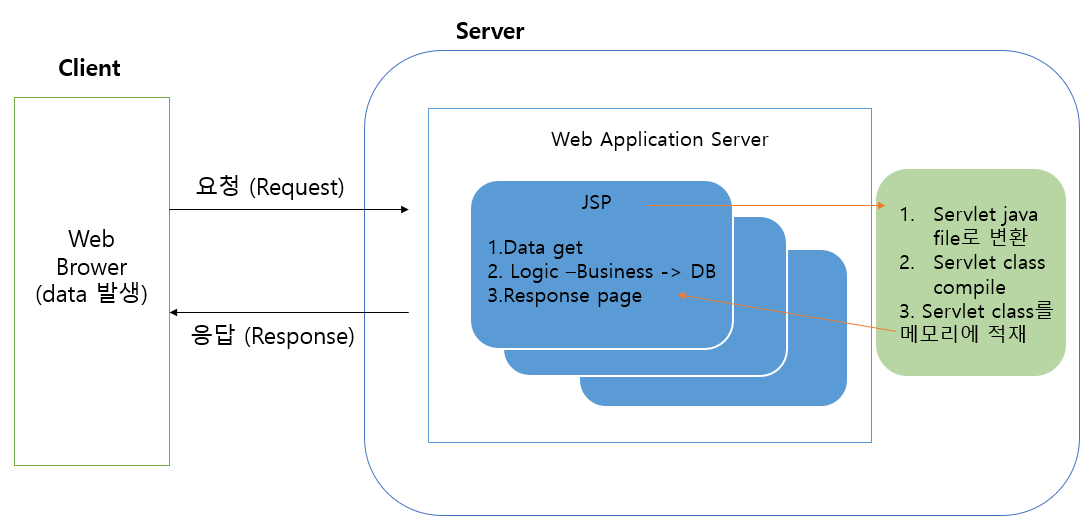 3️⃣ JSP는 웹 애플리케이션 서버의 서블릿 컨테이너에서 서블릿 원시코드로 변환
