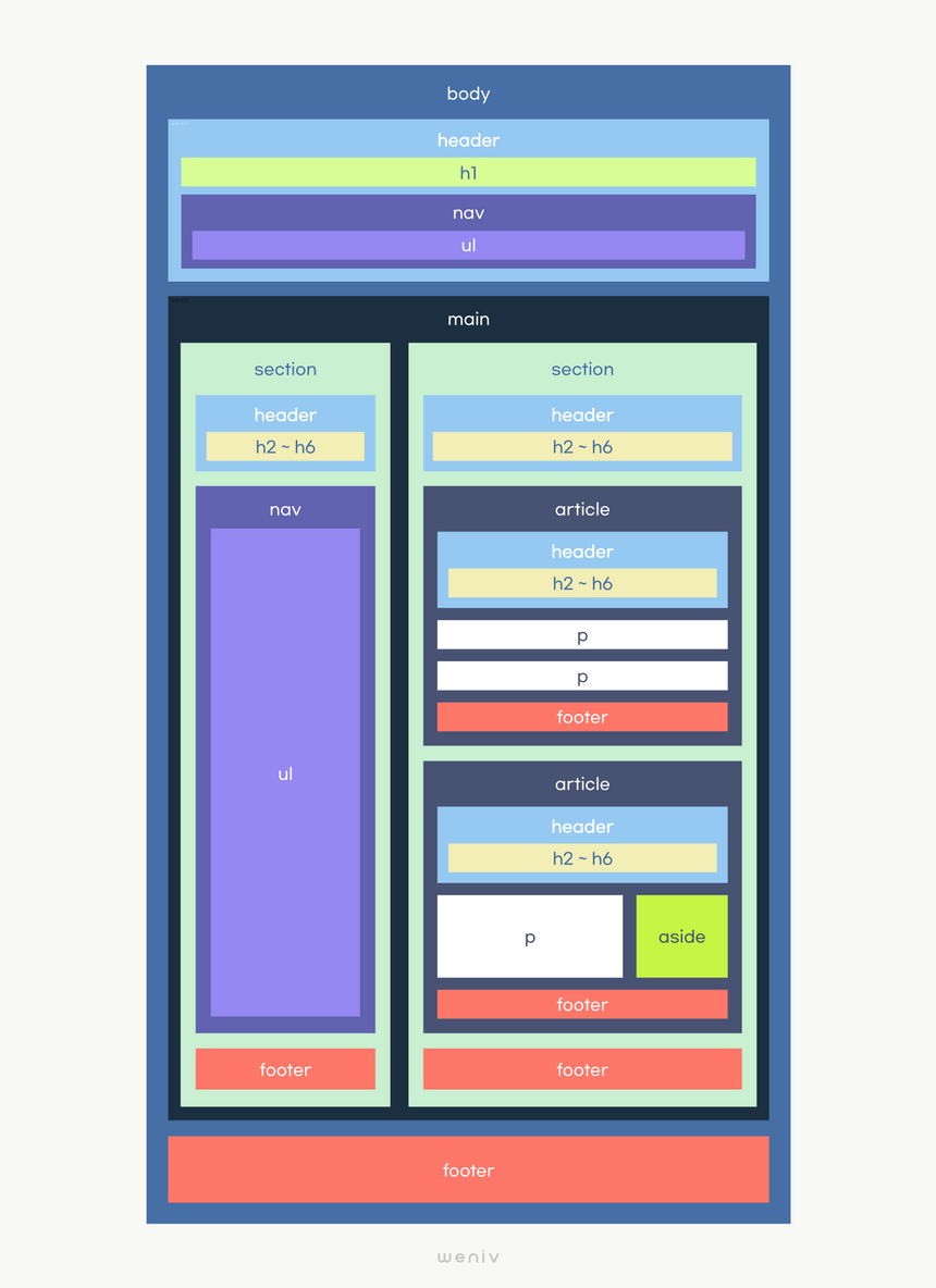 컨텐츠의 시작 부분을 나타내는 요소. 구역의 제목. 헤딩 엘리먼트를 포함하거나 헤딩 없이 목차, 검색폼 같은 내용을 감싸기도 한다.