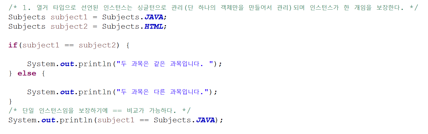 열거 타입으로 선언된 인스턴스는 싱글턴으로 관리(단 하나의 객체만을 만들어서 관리)되며 인스턴스가 한 개임을 보장한다.