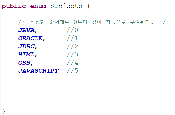 작성한 순서대로 0부터 값이 자동으로 부여된다.