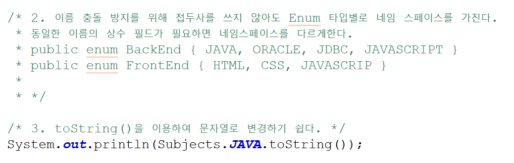 이름 충돌 방지를 위해 접두사를 쓰지 않아도 Enum 타입별로 네임 스페이스를 가진다.