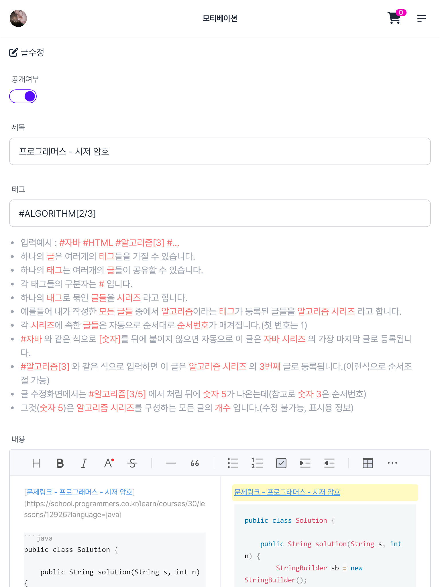 Motivation 에서 post 들은 동일한 해시태그들끼리 묶여 하나의 series 가 된다. 때문에 post 의 해시태그는 그 순서를 보장하고 변경할 수 있어야 한다. ( 위 이미지에서 #ALGORITHM 뒤에 [2/3] 이 그 순서의 보장이다 ) 즉, 위에서 설명한 Article, Lecture 의 해시태그에 순서를 보장하는 기능이 더해져야 함을 뜻한다. ( 필드에 sortNo 이 있어야 한다던가... )