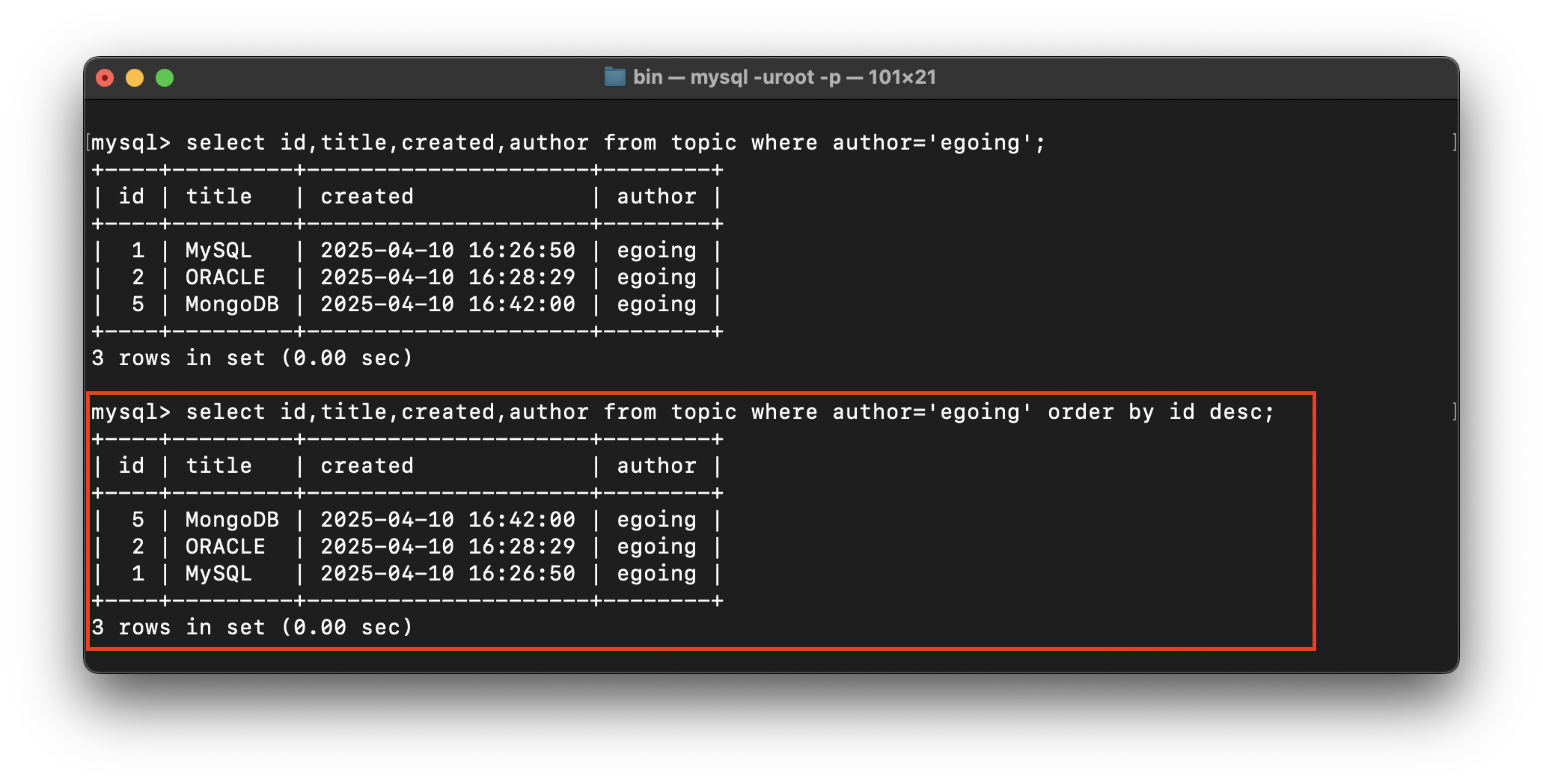 select id,title,created,author from topic where author='egoing' order by id desc;