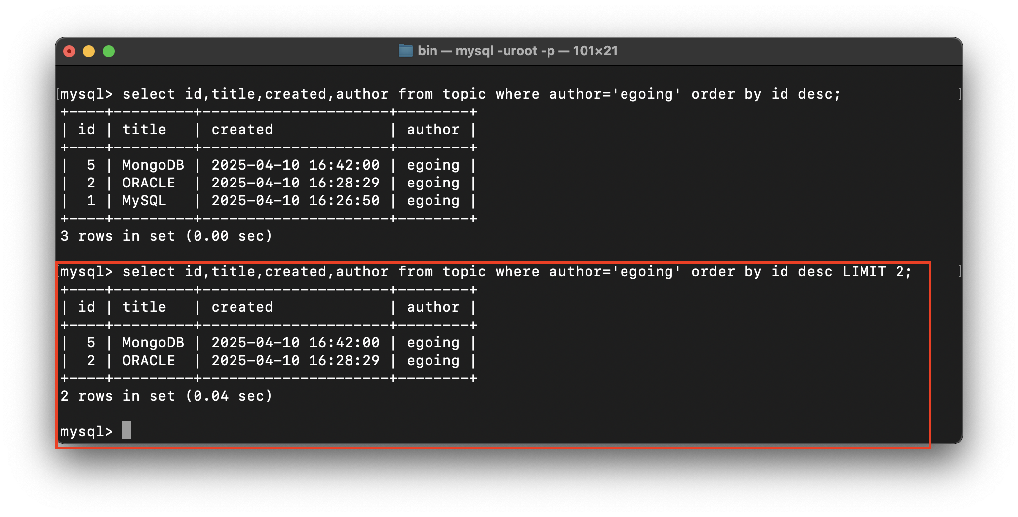 select id,title,created,author from topic where author='egoing' order by id desc LIMIT 2;