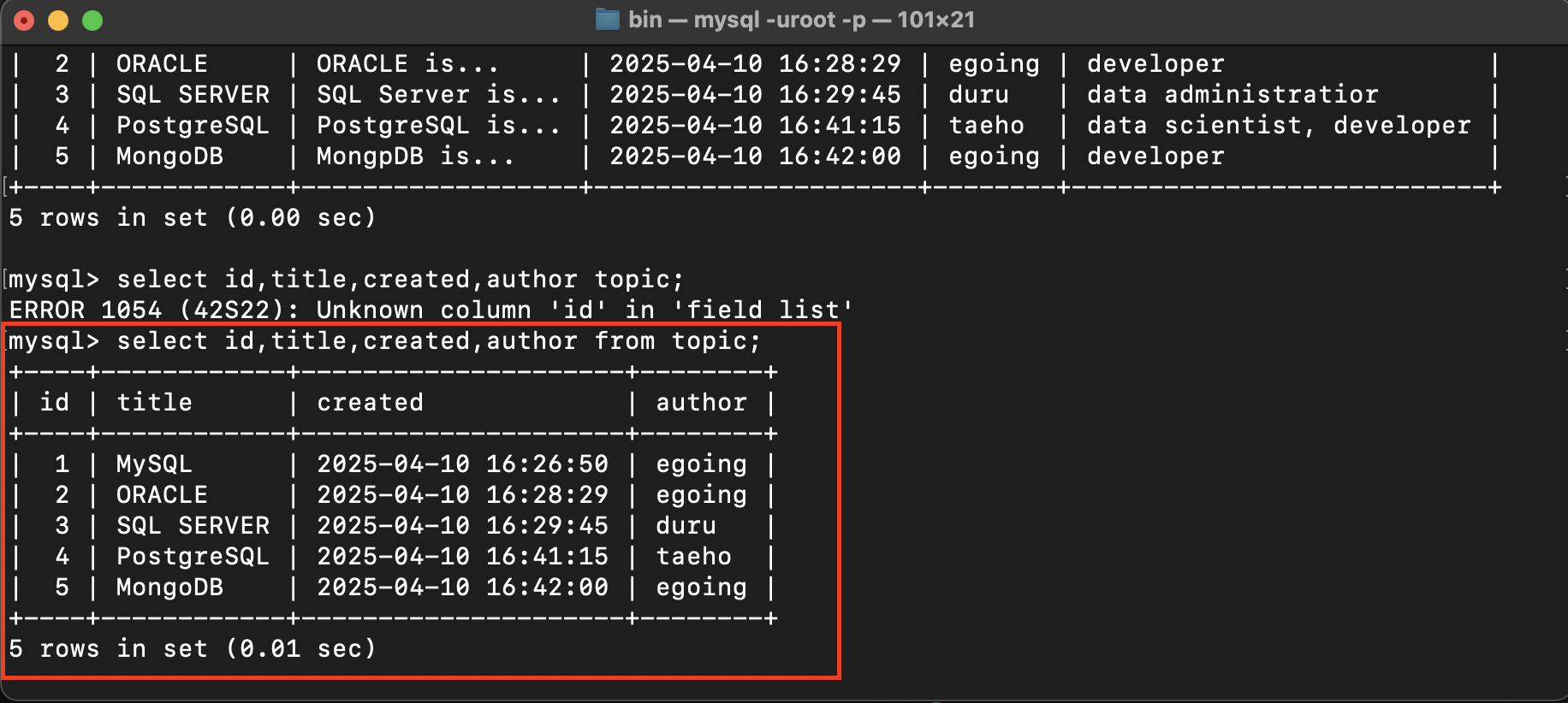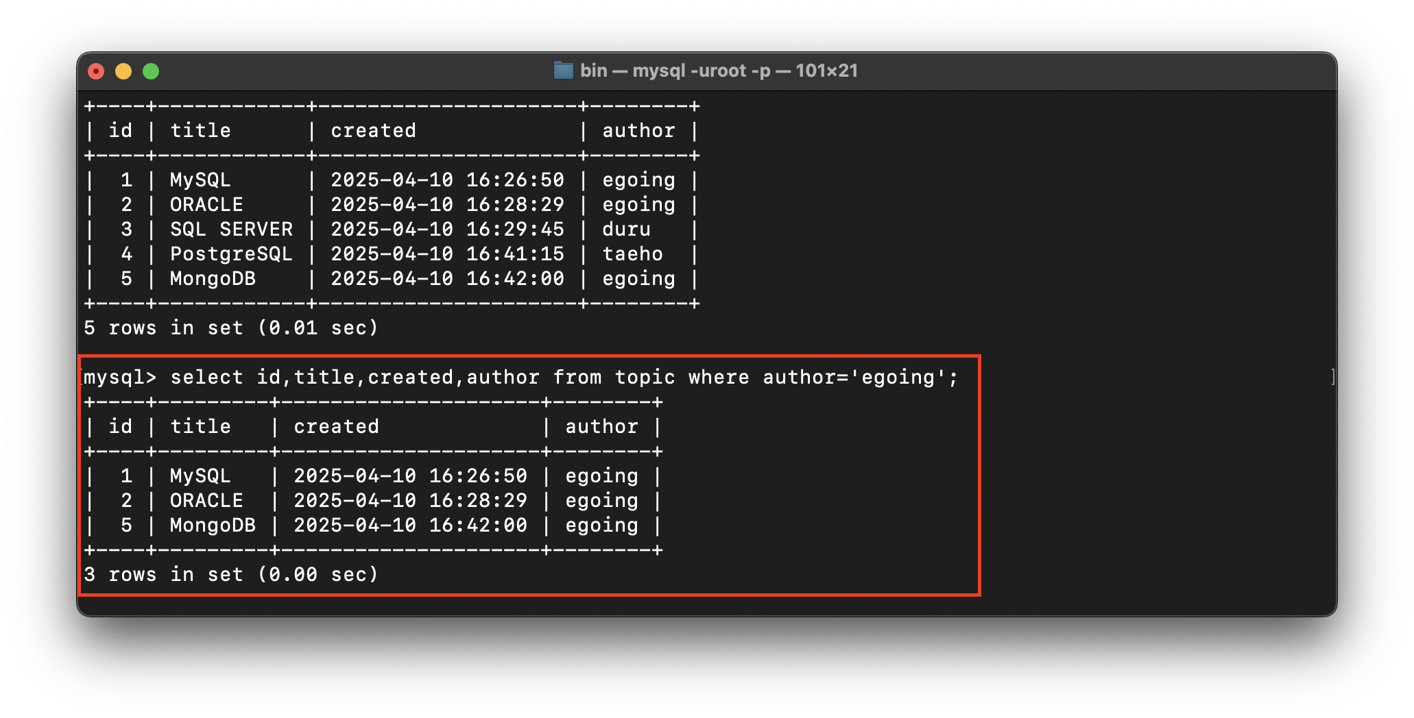 select id,title,created,author from topic where author='egoing';