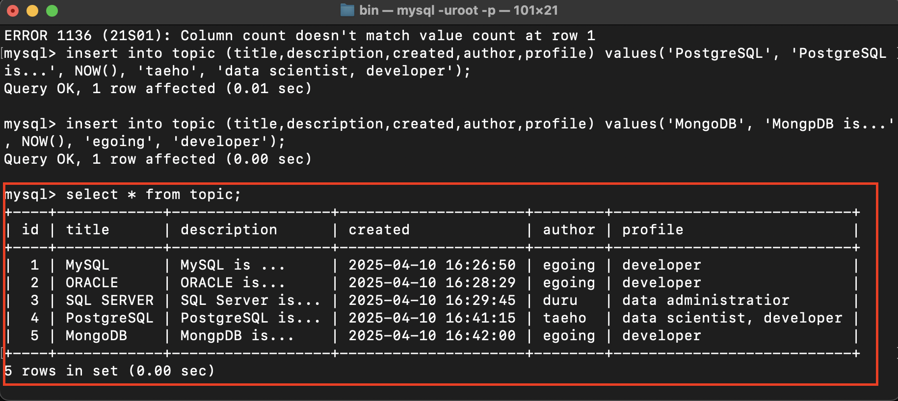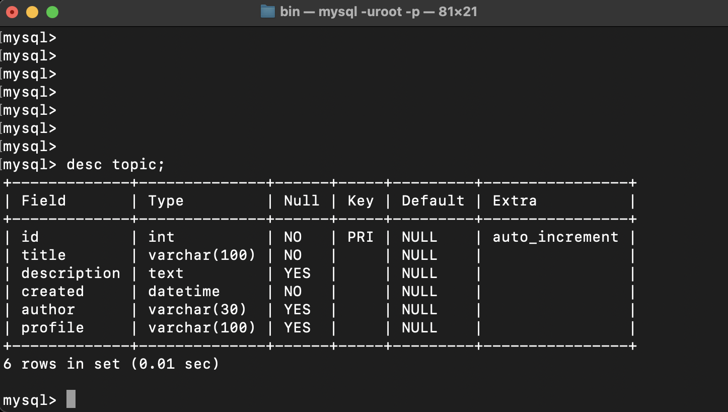 insert into topic (title,description,created,author,profile) values('SQL SERVER', 'SQL Server is...', NOW(), 'duru', 'data administratior');