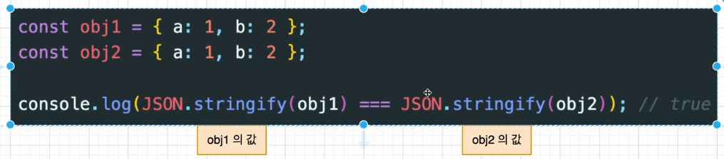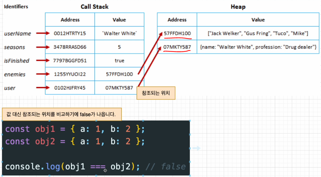 그래서obj1과obj2는 생긴 건 같아도 다른 주소를 갖기에 false 나옴