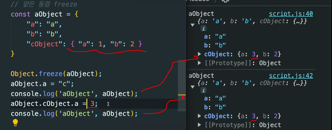 Object.freeze(obj); // 얕은 동결