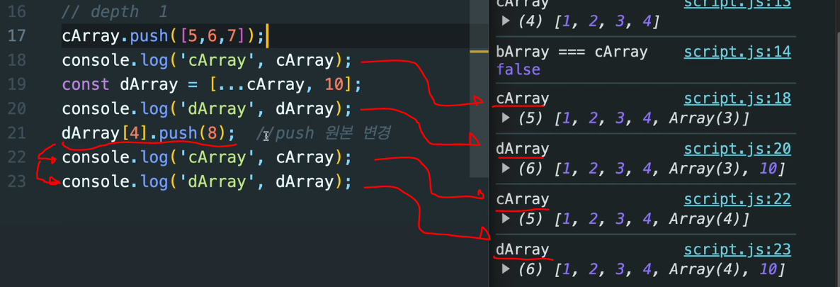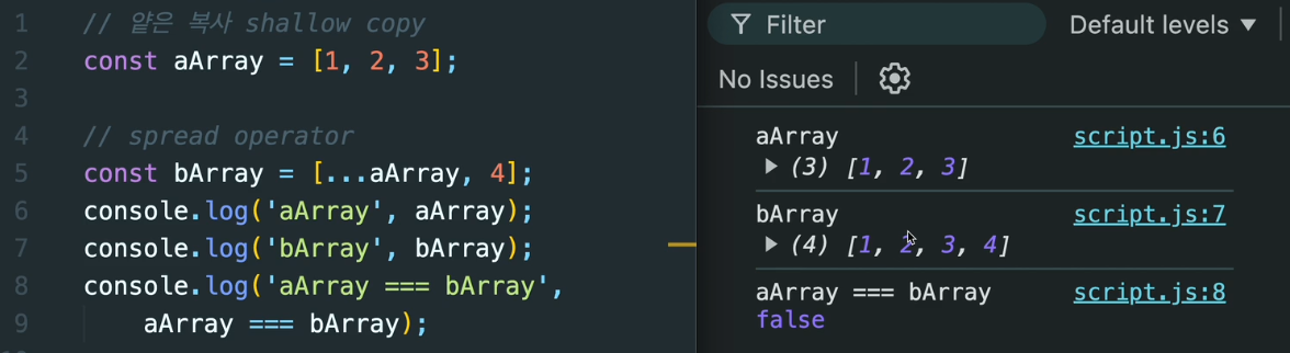 // 원본도 바뀜! → 내부 배열은 같은 객체를 가리킴