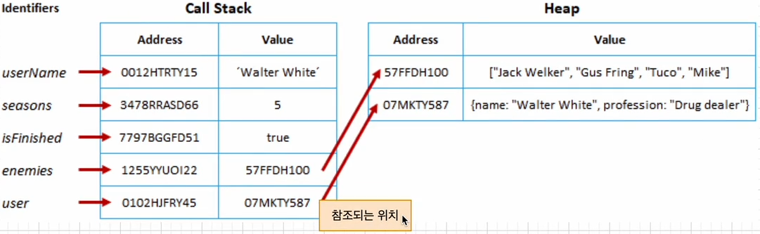 👉 값 혹은 속성 비교하지 않고 '참조 되는 위치'를 비교