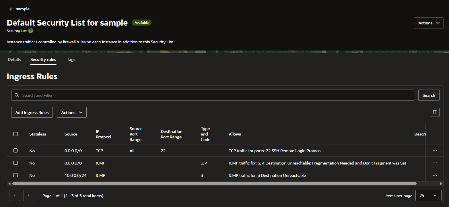 Default로 바인딩된 Security List가 존재한다. 해당 리스트를 누르고 Security rules 탭으로 이동한다.