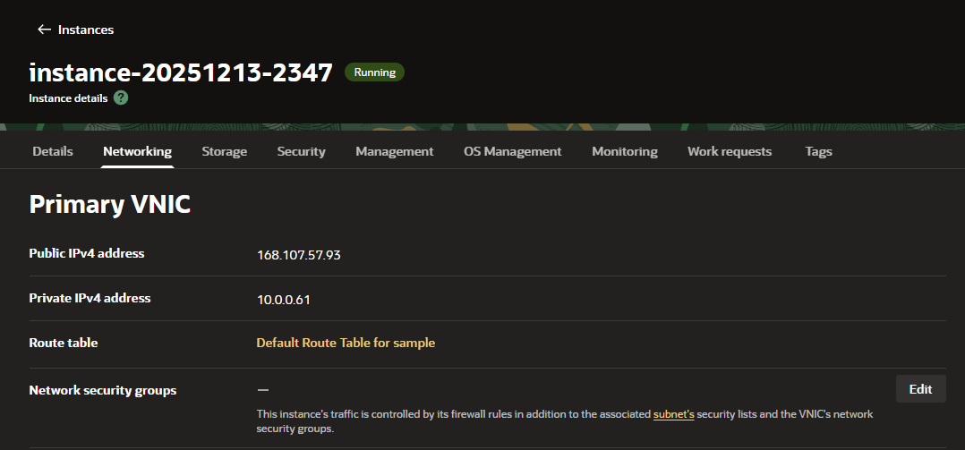 만약 이 설정을 통해서도 외부 접근이 불가능하다면 VM Instance를 확인해야 한다. Compute의 해당 VM Instance의 Detail에 접근하여, Networking 탭의 Network security groups (이하 NSG)가 바인딩 되어있다면 여기서 동일하게 포트를 오픈해야한다. 불필요하다면 제거할 수도 있다.