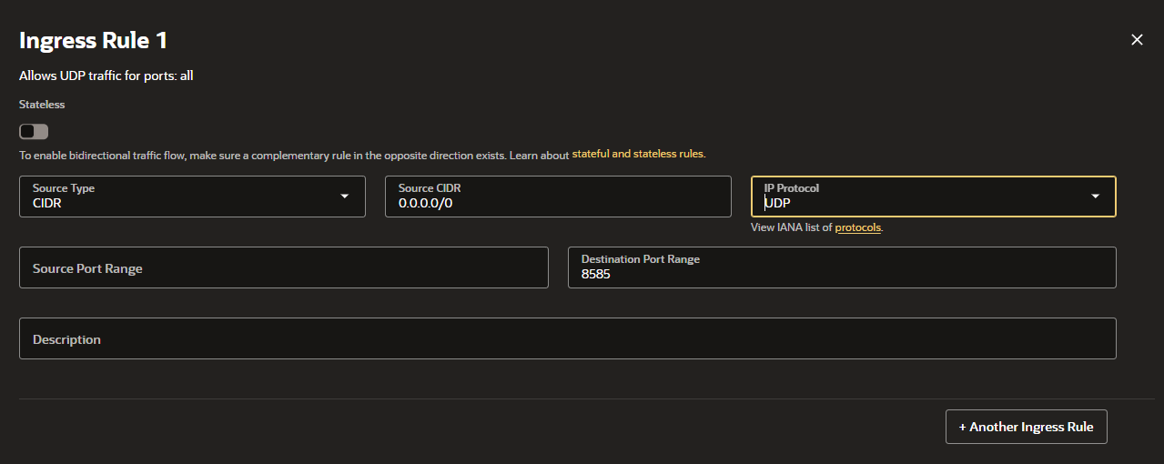 이 설정을 통해 VM Instance에서 UDP 8585를 Listen중이라면 외부에서 UDP 8585 포트로 접속할 수 있다.